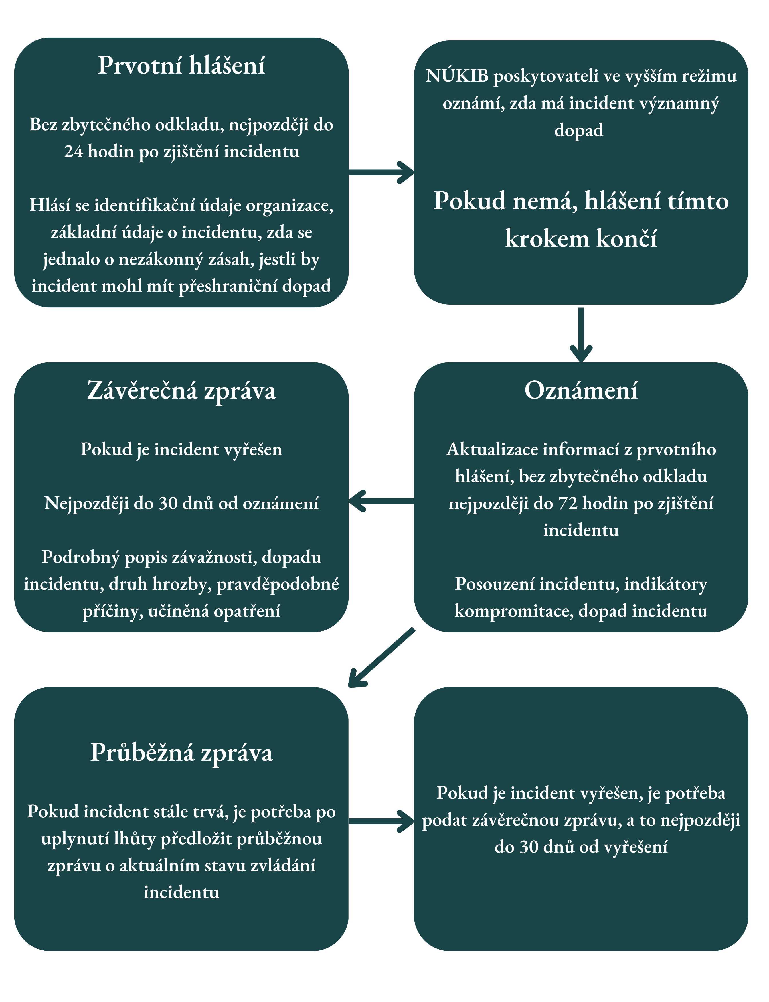 Jednou z hlavních povinností, které nový kybernetický zákon zavádí, je nahlašování bezpečnostních incidentů. Incidentem se rozumí jakékoliv narušení bezpečnosti informací. Povinnost hlásit incidenty existuje v obou regulatorních stupních, a to nejpozději do jednoho roku od doručení rozhodnutí o registraci NÚKIBem. Co, kdy a komu hlásit se však podle regulatorních stupňů liší: