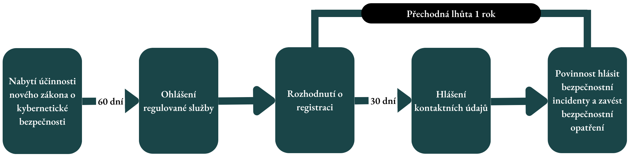 Nový zákon zavádí lhůty, které je nutné dodržet. Od doby nabytí účinnosti zákona běží firmám šedesátidenní lhůta na ohlášení regulované služby přes portál NÚKIB, ten následně firmu zaregistruje. Ode dne registrace poté běží dvě lhůty: třicetidenní k nahlášení kontaktních údajů a přechodná lhůta jednoho roku k implementaci povinností.